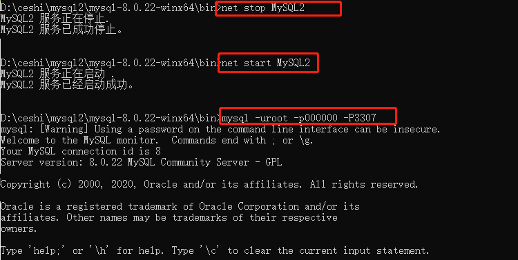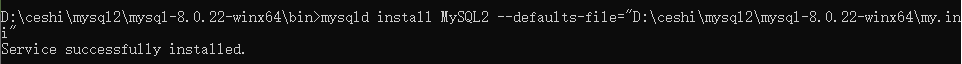 mysqld install MySQL2 --defaults-file="D:\ceshi\mysql2\mysql-8.0.22-winx64\my.ini" |