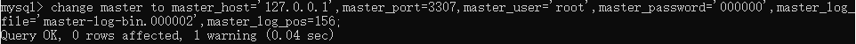 change master to master_host='127.0.0.1',master_port=3307,master_user='root',master_password='000000',master_log_file='master-log-bin.000002',master_log_pos=156; |