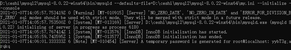 mysqld --defaults-file=D:\ceshi\mysql2\mysql-8.0.22-winx64\my.ini --initialize --console |