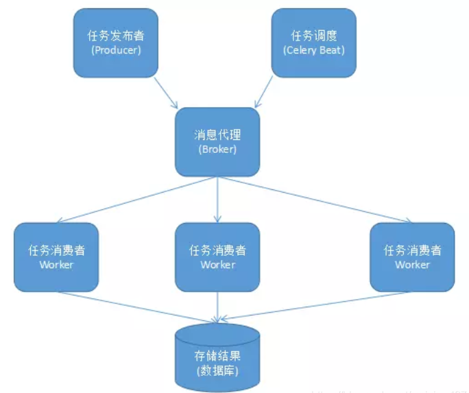 Celery Beat: 任务调度器. Beat 进程会读取配置文件的内容,周期性的将配置中到期需要执行的任务发送给任务队列.Celery Worker: 执行任务的消费者,通常会在多台服务器运行多个消费者,提高运行效率.Broker: 消息代理,队列本身。也称为消息中间件。接受任务生产者发送过来的任务消息,存进队列再按序分发给任务消费方 (通常是消息队列或者数据库).Producer: 任务生产者。调用 Celery API , 函数或者装饰器,而产生任务并交给任务队列处理的都是任务生产者.Result Backend: 任务处理完成之后保存状态信息和结果,以供查询.